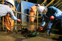 | 최정우 포스코그룹 회장(오른쪽)이 지난 17일 침수 피해를 크게 입은 포항제철소 압연지역(후판공장) 지하에서 직원들과 함께 토사 제거 작업을 하고 있다. 연합뉴스 |