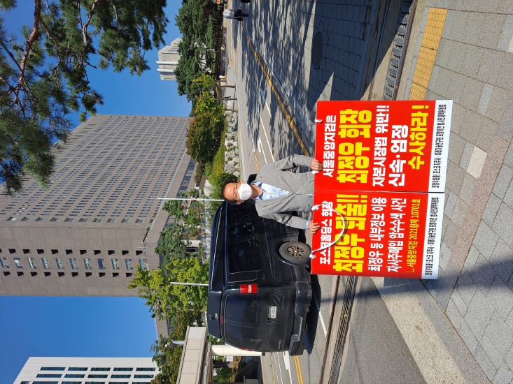 포스코지주사·미래기술연구원 포항이전 범시민대책위원회(위원장 강창호, 이하 범대위) 임종백 공동집행위원장은 지난 11일부터 서울 중앙지검 및 용산 대통령실 앞에서 포스코 자사주 매입 의혹 사건 관련 최정우 회장에 대한 신속하고 엄정한 수사를 촉구하는 1인 시위를 재개했다.