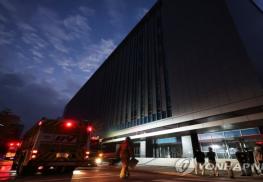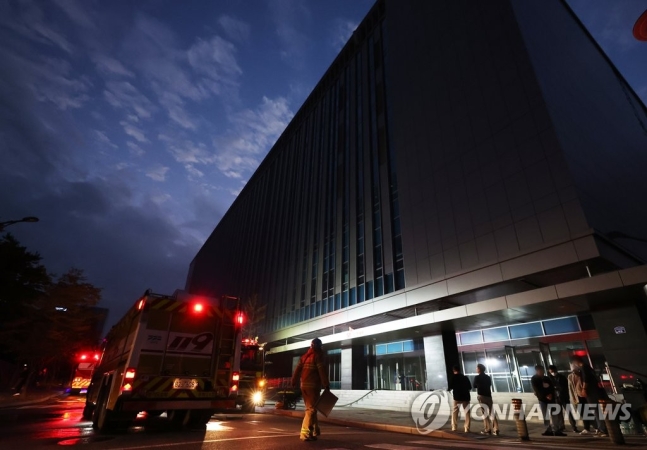 15일 오후 화재가 발생한 경기도 성남시 분당구 삼평동 SK 판교 캠퍼스 A동에서 소방관들이 분주하게 움직이고 있다.이 불로 현재 카카오톡, 포털사이트 다음 등 통신 장애가 발생하고 있다. 연합뉴스
