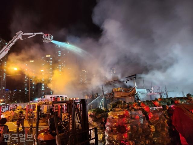 | 소방대원들이 25일 오후 8시 27분쯤 불이 난 대구 북구 매천시장(대구농수산물도매시장)에서 진화작업을 벌이고 있다. 소방청 제공 |