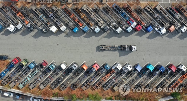 화물연대 총파업, 멈춰 선 트레일러...24일 부산 남구 한 화물차 주차장 모습.연합뉴스 |