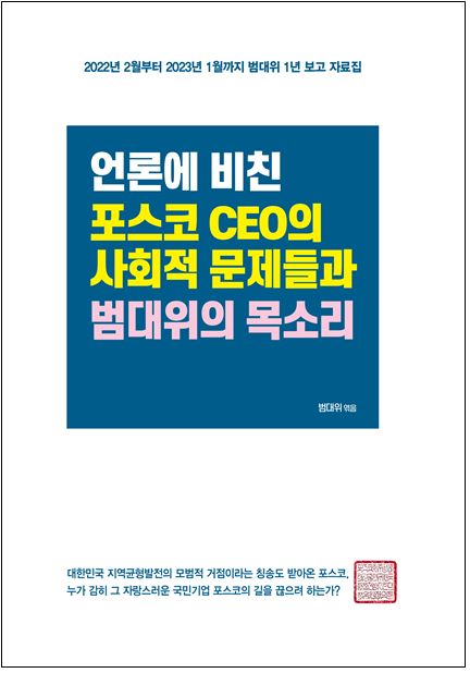 포스코 지주사 본사 ㆍ미래기술연구원 포항이전 범시민대책위원회(이하 범대위,대표 강창호)가 2022년 2월부터 2023년 1월까지 1년을 결산하는 보고 자료집 <언론에 비친 포스코 CEO의 사회적 문제들과 범대위의 목소리>를 발간했다.