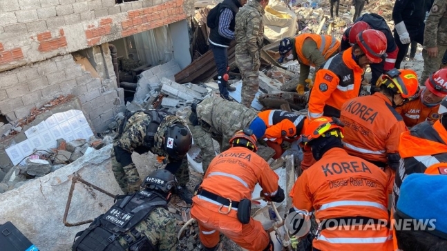 대한민국 긴급구호대가 11일 튀르키예 하타이주 안타키아에서 현지 구조팀과 합동으로 구조활동을 벌이고 있다.대한민국 긴급구호대 제공. 연합뉴스 |