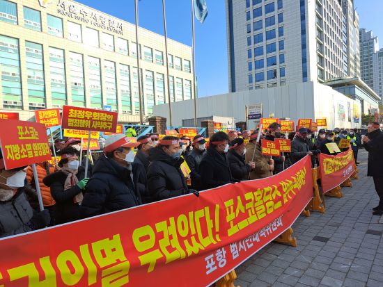 1. 포항시민 1천여명이 14일 오전 서울 수서경찰서 앞에서 포스코홀딩스 최정우 회장에 대한 신속·엄정 수사를 촉구하는 시위를 벌이고 있다.