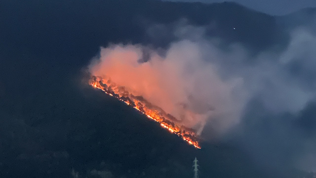 산 중턱에서 시작된 불은 현재 정상부로 확산 중이다.