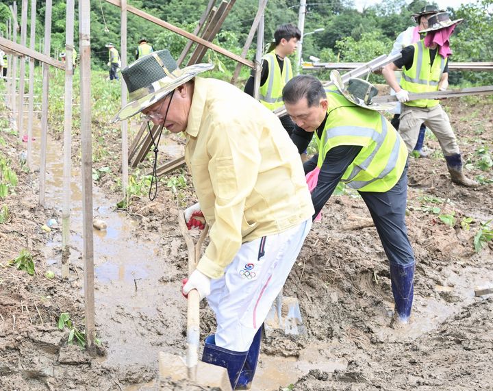 | 홍준표 대구시장이 24일 오전 수해로 어려움을 겪고 있는 경북 예천군 감천면에서 자원봉사를 하고 있다/사진=대구시 제공 |