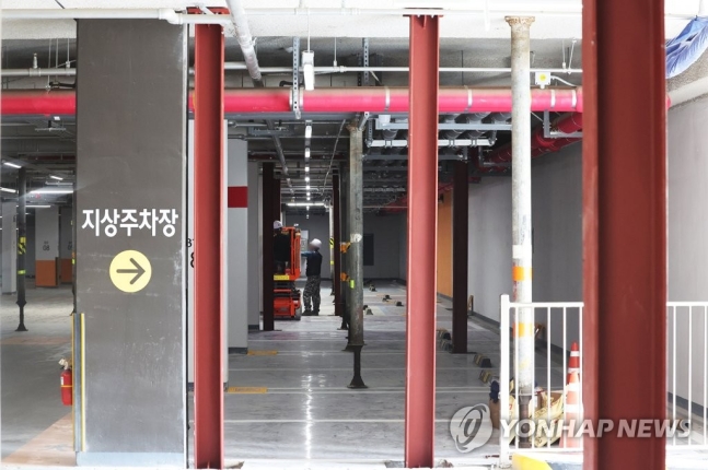 3일 지하 주차장 무량판 구조 기둥 일부에 철근이 빠진 것으로 확인된 경기도 오산시의 한 LH 아파트에서 보강 작업이 진행되고 있다. 연합뉴스