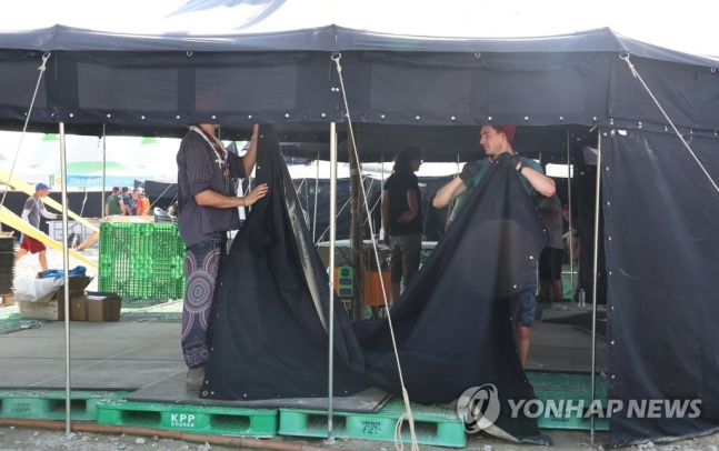 독일 스카우트 대원들이 7일 전북 부안군 잼버리장 델타구역 내 부스를 철거하고 있다.연합뉴스