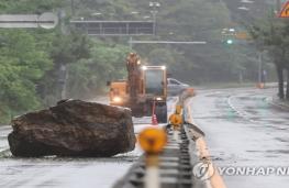 낙석으로 통제된 도로제6호 태풍 카눈이 북상하고 있는 10일 오전 울산시 동구 방어진순환도로에 가로 3m, 세로 4m 크기 바위가 인근 산에서 굴러떨어져 양방향 통행이 통제되고 있다.연합뉴스