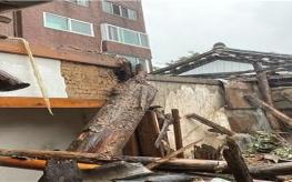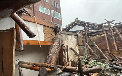 10일 한반도를 관통 중인 제6호 태풍 '카눈'의 영향으로 지붕이 무너진 서울 종로구 필운동의 한옥 건물 모습. 종로소방서 제공 |