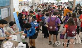 12일 오전 인천국제공항에서 세계스카우트 잼버리 대원들이 출국 전 선물을 받고 있다. 공항사진기자단 연합뉴스