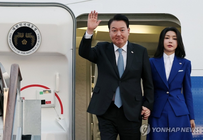| 4박6일 간의 미국 방문 일정을 마친 윤석열 대통령과 김건희 여사가 23일 성남 서울공항을 통해 귀국, 전용기인 공군 1호기에서 내리며 손을 들어 인사하고 있다.연합뉴스 |