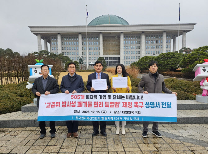한국원자력산업협회 노백식 상근부회장과 세아에스에이 정나겸 부사장, 일진파워 김경남 이사는 원자력 기업 및 단체를 대표해 15일 국회를 방문해 ‘고준위방사성폐기물 관리 특별법(이하 고준위특별법)’의 신속한 처리를 촉구하는 성명서를 전달했다.
