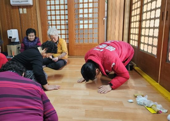 | 문충운 국회의원 예비후보가 지역의 경로당을 찾아 어르신들에게 큰절을 하고 있는 모습. |