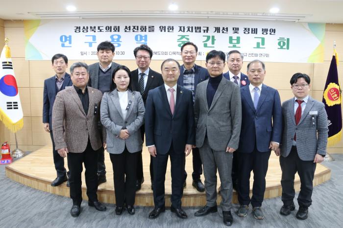 경북도의회 「자치법규 선진화 연구회」(대표 박규탁 의원)는 지난 2일(금) 도의회 다목적실에서 “경상북도의회 선진화를 위한 자치법규 개선 및 정비 방안 연구 용역” 중간보고회를 개최했다.