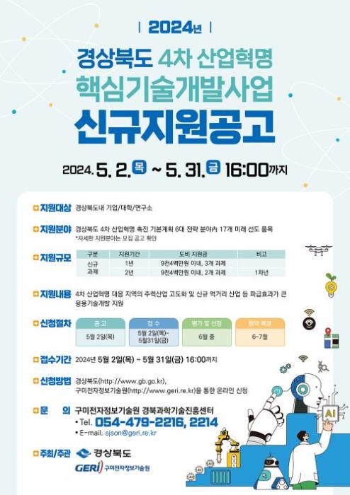 경상북도는 5월 말까지 2024년 경북 4차산업혁명 핵심기술 개발사업 신규 과제에 참여할 도내 기업체, 대학, 연구기관 등을 공개 모집한다.