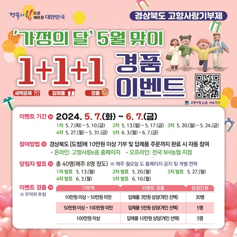 경북도는 5월 가정의 달을 맞아 고향사랑기부제에 대한 관심을 높이고 기부 시기 분산, 기부자의 만족도를 올리는 1+1+1 경품 이벤트를 진행한다.