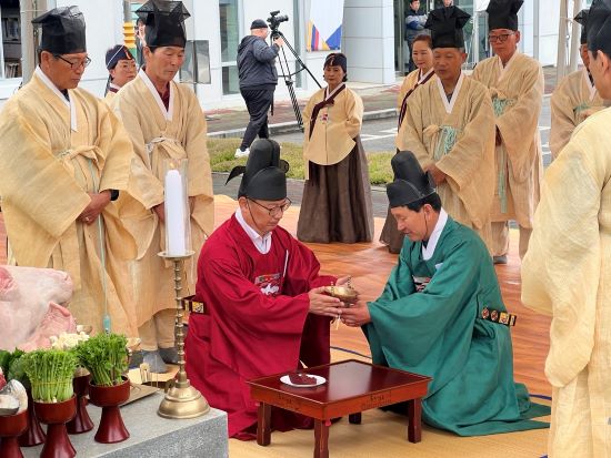 ‘풍잠기원제’는 상주시 함창 향교의 집전으로 김주령 경상북도 농축산유통국장의 강신(신을 맞이하는 예절)과 초헌례(첫번째 잔을 올리는 의식), 채현식 함창향교 전교의 아헌례(두번째 잔), 오홍섭 명주잠업 영농조합 법인대표의 종헌례(세번째 잔), 누에 첫밥 주기 시연회 순으로 진행됐다.