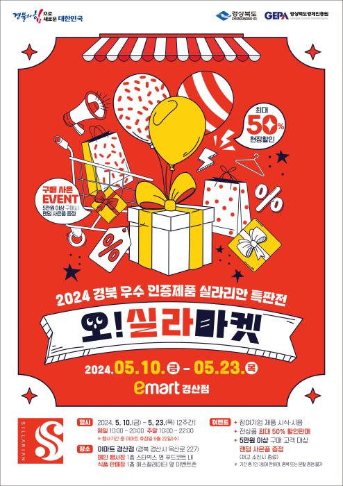 경북도는 실라리안 제품 홍보와 소비 촉진을 위해 10일부터 23일까지(약 2주간) 이마트 경산점에서 ‘2024 경북 우수 인증 제품 실라리안 특판전’을 개최한다.