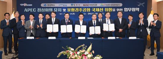 경상북도는 14일 도청 사림실에서 포항시, 경주시, 한국공항공사 포항경주공항, 경상북도문화관광공사와 함께 2025 APEC 경주 유치 지원과 포항경주공항 국제선 부정기편 운항을 위한 업무협약을 체결했다.