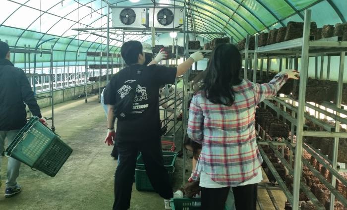 일손 돕기 참여자들은 지역에 이주한 청년 농가에서 표고버섯을 수확하고 버섯 배지를 폐상하는 작업을 도왔다.
