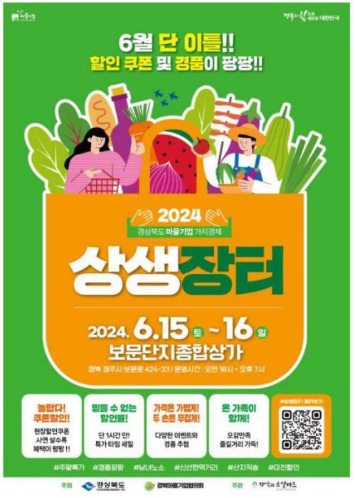 경북도는 15일부터 16일까지 2일간 경주시 보문단지종합상가(보문로 424-33)에서‘2024년 경상북도 마을기업 가치경제 상생장터(이하 상생장터)’를 개최한다.