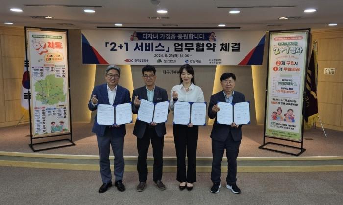 경북도는 25일 한국도로공사 대구경북본부에서 대구시, 한국도로공사 대구경북본부, 대구경북 휴게소협의회와 ‘다자녀가정 응원 2+1 서비스’ 협약을 체결하고 7월 1일부터 서비스를 개시한다.
