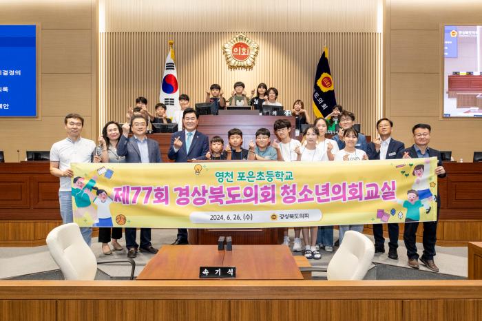 경북도의회(의장 배한철)는 6월 26일 경상북도의회 본회의장에서 영천 포은초등학교 5~6학년 학생 20여 명과 교장선생님, 지도교사가 참여한 가운데 제77회 경상북도의회 청소년의회교실을 개최했다.