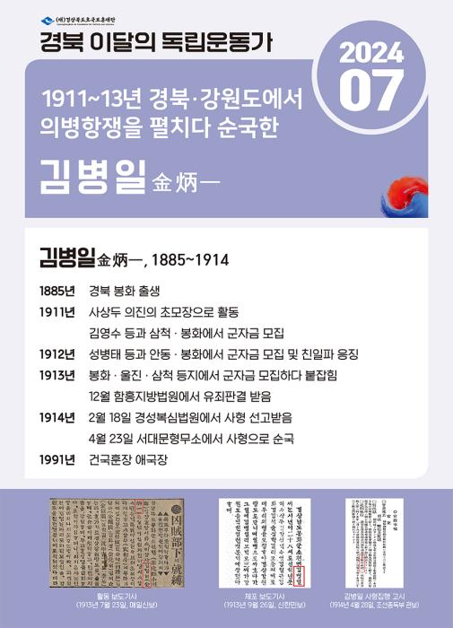 이번 경북 7월의 독립운동가로 선정된 김병일(金炳一, 1885~1914) 선생은 봉화 출신으로 경상도·강원도에서 의병활동을 전개하였다. 1911년 사상두 의진에서 활동하며 김영수 등과 함께 봉화·삼척 등지에서 군자금을 모집 하였으며, 1912년에는 성병태 등과 안동에서 군자금을 모집하였다. 더불어 봉화 소천면에서 일본인에게 협조한 이들의 집을 불태우는 등 항일투쟁을 전개하였다.