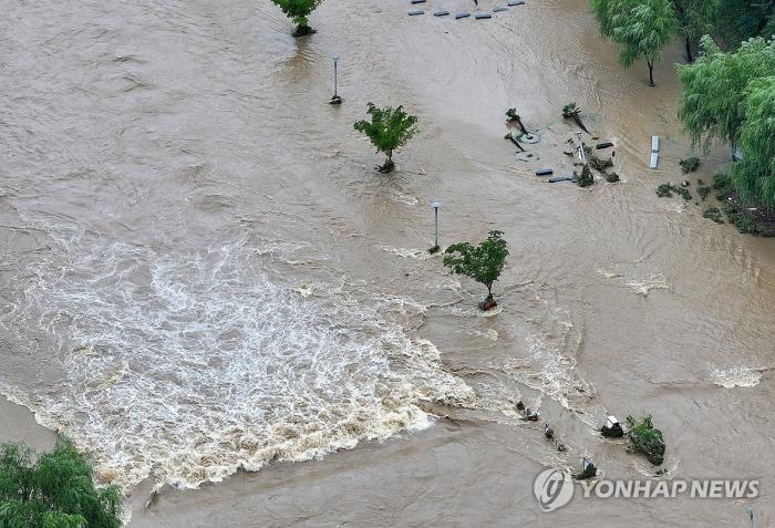 10일 오전 대구 북구 구암동 동천역 인근 팔거천이 폭우로 인해 수위가 높아져 인근 둔치가 물에 잠겨 있다. 연합뉴스