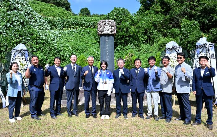 파리올림픽 여자 유도 57kg급 은메달과 유도 혼성단체 동메달을 획득한 허미미(21·경북체육회) 선수가 6일 한국에서의 첫 일정으로 군위군 삼국유사면 집실마을을 찾아 현 조부(5대조)인 허석(1857∼1920) 의사 기적비를 참배했다.