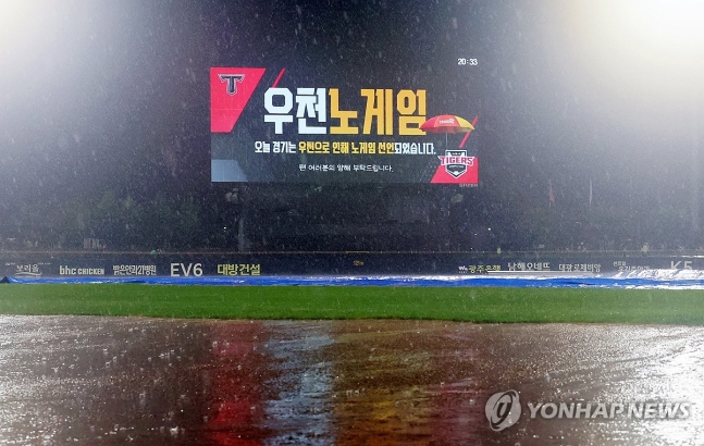 20일 광주기아챔피언스필드에서 열린 프로야구 롯데 자이언츠와 KIA 타이거즈의 경기가 롯데의 4회초 공격 때 세차게 내리기 시작한 비가 계속 돼 우천노게임이 선언됐다. 연합뉴스