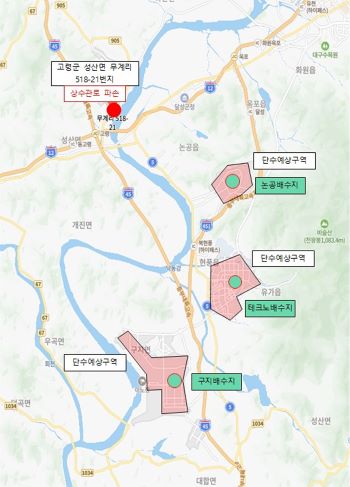 30일오후에 발생한 고령군 시행 도로확장공사 현장에서 발생한 상수관로 파손으로 공업용수 공급 재개가 늦어져 공업용수 단수시간 지연 및 흐린 물 출수가 예상되고 있다고 대구시가 31일 밝혔다..