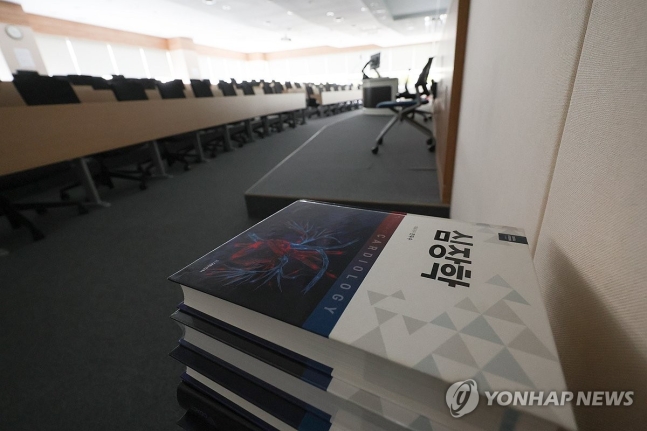 | 대통령실이 2026학년도 의과대학 증원 규모를 조정할 수 있으며 여·야·의·정 협의체도 구성할 수 있다는 입장을 밝힌 6일 서울 시내 한 의대 강의실에 심장학 이론서가 쌓여 있다. 연합뉴스 |