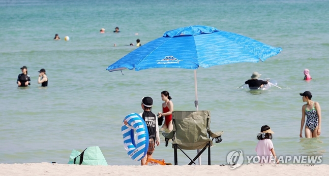 | 폭염특보가 발효 중인 7일 제주레저힐링축제가 열리는 제주시 조천읍 함덕해수욕장에서 피서객들이 물놀이하며 더위를 식히고 있다. 연합뉴스 |