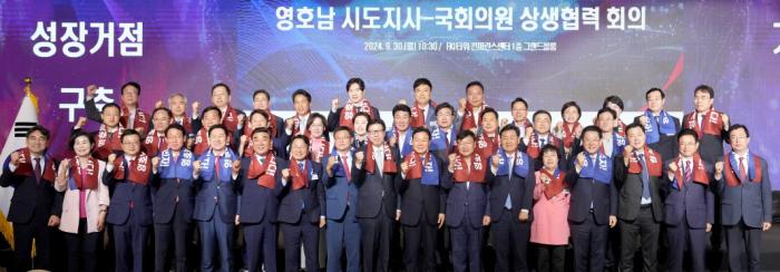 이후 영호남 8개 시도지사와 국회의원들은 수도권에 대응하는 남부권 성장거점 구축을 위한 공동결의문을 채택하며 협력을 다짐했다.