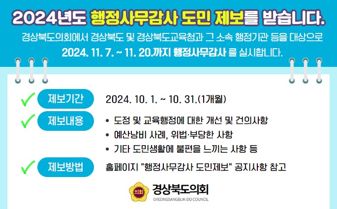 경북도의회(의장 박성만)는 오는 11월 제351회 정례회 기간중에 실시하는 2024년도 행정사무감사를 앞두고, 도민들로부터 각종 의견과 제보를 받아 행정사무감사에 적극 반영하는 『도민 제보』를 운영한다고 1일 밝혔다.
