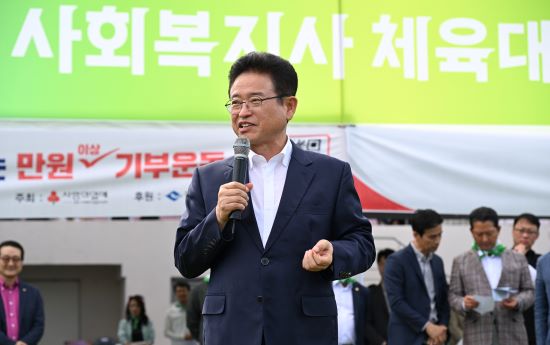| 이철우 경북도지사가 ‘제16회 경상북도 사회복지사 체육대회’에서 인사말을 하고 있다/경북도 제공 |