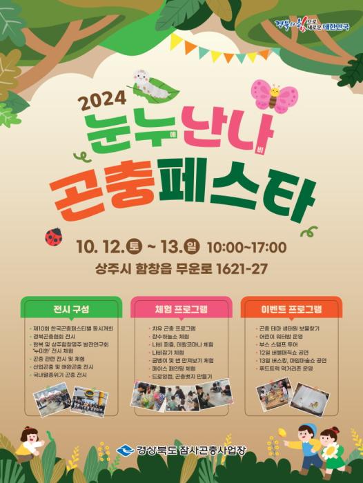 경북도는 대표 곤충 축제 ‘2024 눈누난나 곤충페스타’가 오는 12일, 13일 양일간 상주시 함창읍 경북도 잠사곤충사업장 일원에서 열린다고 10일 밝혔다.