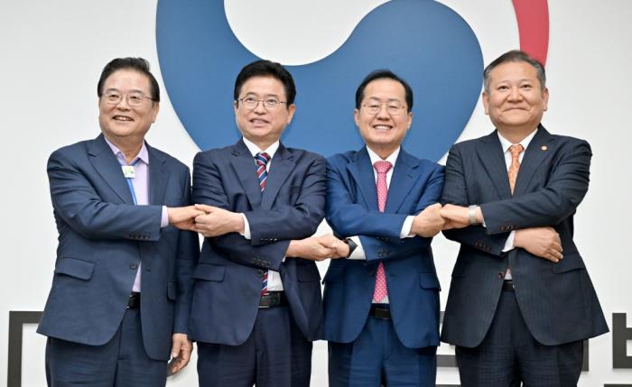 21일 정부서울청사에서 이상민 행정안전부장관, 우동기 지방시대위원장, 홍준표 대구광역시장, 이철우 경북도지사가 대구·경북 통합을 위한 공동 합의문에 서명했다.