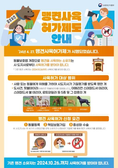 맹견 소유자는 1년간의 계도기간에 맹견 사육 허가를 받아야 하며, 이를 위해 경북도는 농식품부와 함께 맹견 소유자 대상 설명회와 컨설팅 지원 등을 지원할 계획이다.