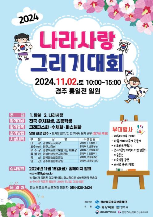 나라사랑 그리기 대회는 미래세대인 아동·청소년들의 보훈의식 함양을 위해 진행하는 행사로, 11월 2일 경주 통일전에서 펼쳐질 예정이다.