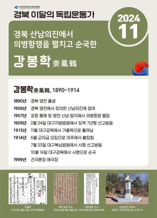 경북도호국보훈재단(대표이사 한희원)은 경북 11월의 독립운동가로 산남의진에 참여하여 의병항쟁을 펼치다 순국한 영천의 강봉학을 선정하였다고 3일 밝혔다.
