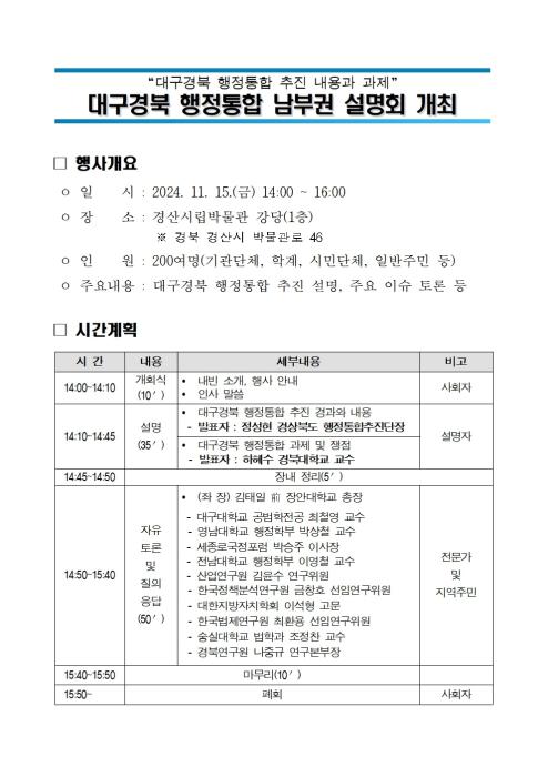 경북도 행정통합 주민설명회 장소 변경