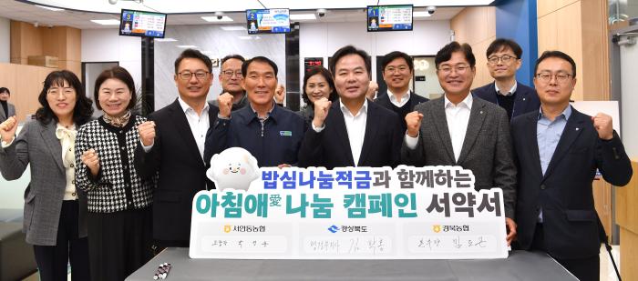 경북도와 농협중앙회 경북본부는 18일 서안동농협 신도청지점에서 건강한 쌀 소비문화 확산을 위한 사회공헌형 상품 ‘밥心나눔적금’ 가입행사를 열었다.