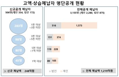 전체 체납액 규모별로 살펴보면 3천만원 미만 체납자가 283명으로 전체의 56%를 차지해 가장 많고, 3천만~5천만원이 98명, 5천만~1억원 80명, 1억원 이상은 45명으로 집계됐다.
