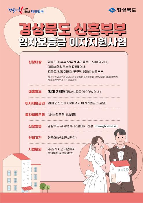 배용수 경북도 건설도시국장은 “이번 확대 혜택으로 조금이나마 신혼부부 주거비 부담을 완화하는 데 보탬이 되고 안정적인 주거생활 환경 조성에 도움이 되길 바란다”며 “앞으로도 신혼부부의 주거비에 대한 경제적 부담을 줄이고 저출생 해결에 최선을 다하겠다”고 말했다.