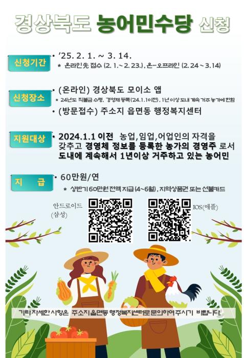 김병기 경북도 농업대전환 과장은 “농어민수당 신청 자격을 갖춘 농가가 누락 되는 사례가 없도록 모바일과 거주지 읍면동행정복지센터로 빠짐없이 신청해 주시기를 바란다”고 전했다.