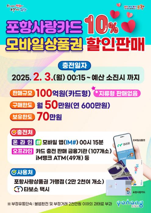 포항시는 내달 3일부터 카드형·모바일 포항사랑상품권(이하 포항사랑카드) 100억 원 규모로 10% 특별 할인판매를 시작한다고 30일 밝혔다.