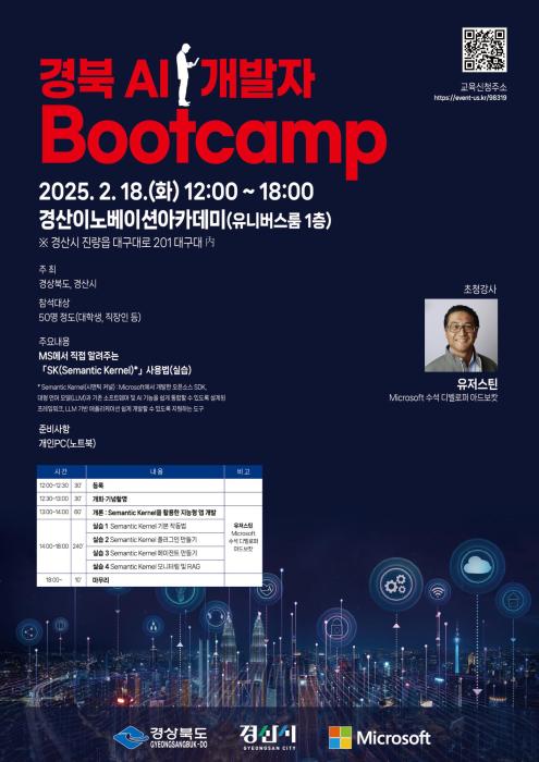 경북도와 경산시는 인공지능 관련 최신 기술을 직접 실습하고 체험할 수 있는 ‘경북 AI 개발자 Bootcamp’를 오는 18일, 경산이노베이션 아카데미 유니버스룸(경산시 진량읍 대구대로 201, 대구대 內)에서 개최한다고 6일 밝혔다.